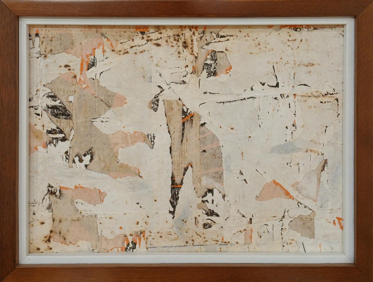 Strappo di palinsesto di manifesti pubblicitari lacerati e incollati su tavoletta di faesite.