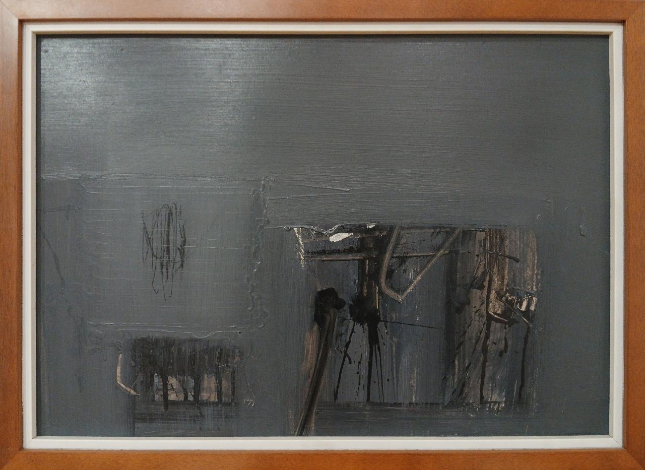Composizione informale ottenuta con più strati pittorici, la superficie è prevalentemente grigio scura con zone che lasciano intravedere lo strato sottostante caratterizzato da colature nere e interventi gestuali-segnici.