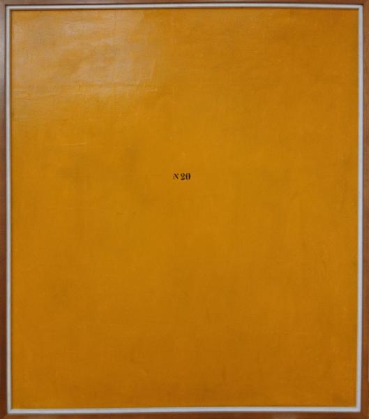 Composizione costituita da una superficie monocroma di colore giallo ottenuta incollando carta da pacchi su tela, poi dipinta con colore a smalto. Al centro, leggermente spostata verso l'alto, l'iscrizione "N20" dipinta in nero con caratteri di tipo "stencil".
