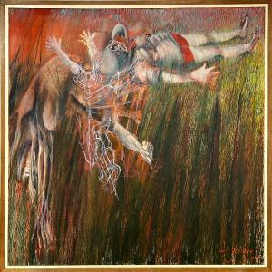 Composizione figurativa di sapore neo-espressionista/surrealista che suggerisce un campo da battaglia. Su un manto erboso reso con pennellate verticali verdi, brune e rosse si trovano tre figure umane interpretabili come un corpo scuoiato, con braccio che tende verso il basso in cui sono evidenti muscoli e tendini, un cadavere disteso e un bambino che alza le braccia al cielo, reso in parte con un semplice disegno bianco tratteggiato.