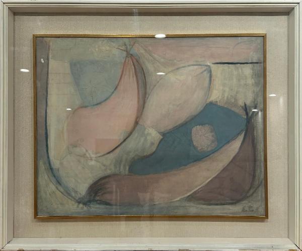 Composizione astratta su fondo chiaro, con forme ispirate al surrealismo che alludono (come da titolo) a forme marine, dipinte con tratti tenui e sinuosi. La scelta cromatica è limitata ai toni chiari tra cui rosa pallido, azzurro pastello e violetto.
