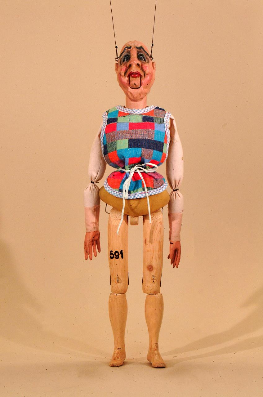 Corpo normale, tagliato ad incastro.\nTesta con bocca mobile con meccanismo a contrappeso.\nOcchi fissi.\nMani mobili con piombatura per bilanciamento con dita separate.\nPiedi fissi con piombatura.\nBilancino originale a croce, metodo Holden.\nIl busto, all'altezza del petto e del bacino ha delle imbottiture permanenti per rendere panciuta la figura.