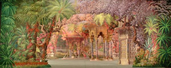 Scenografia in carta, fortezzata col strisce di tessuto di cotone, dipinta ad acqua e composta da un fondale, tre principale con la possibilità di aggiungere tre rompimenti.