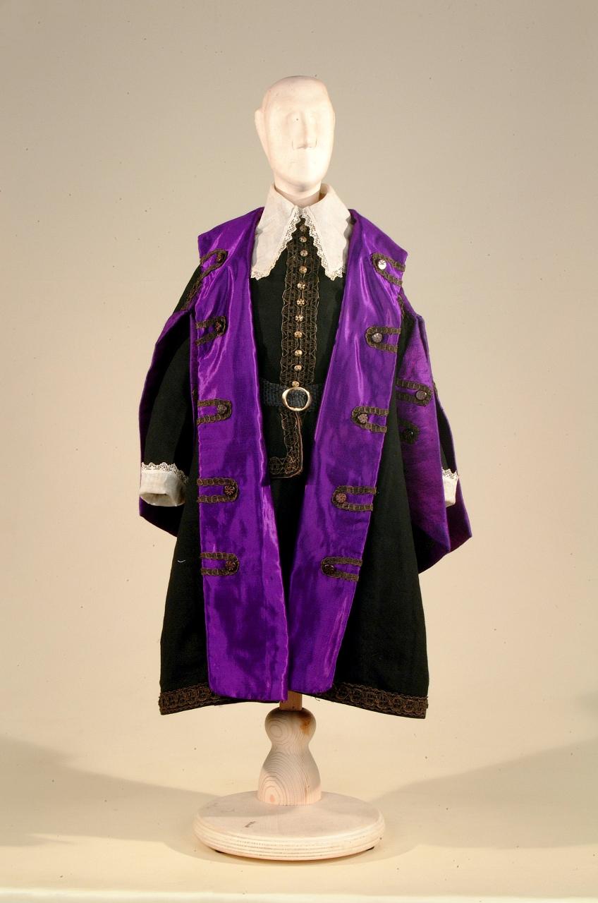 Costume di nobile del '600 costituito da pantaloni, giacca, sopravveste, cintura, collo.