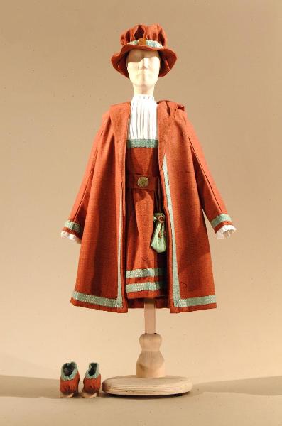 Costume per popolano del 1500 composto da veste, sopravveste, cintura, cappello, scarpe.