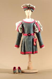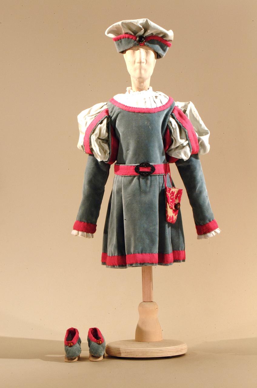 Costume per borghese del 1500 composto da veste, cintura con borsetta, cappello, scarpe.