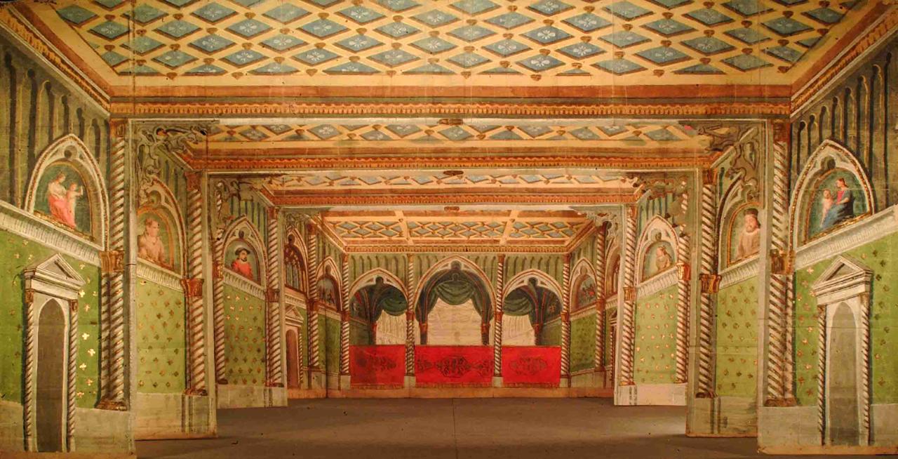 Scenografia in carta dipinta ad acqua e fortezzata con strisce di tela, composta da tre principali e un fondale. Il secondo principale viene posizionato al ponte.