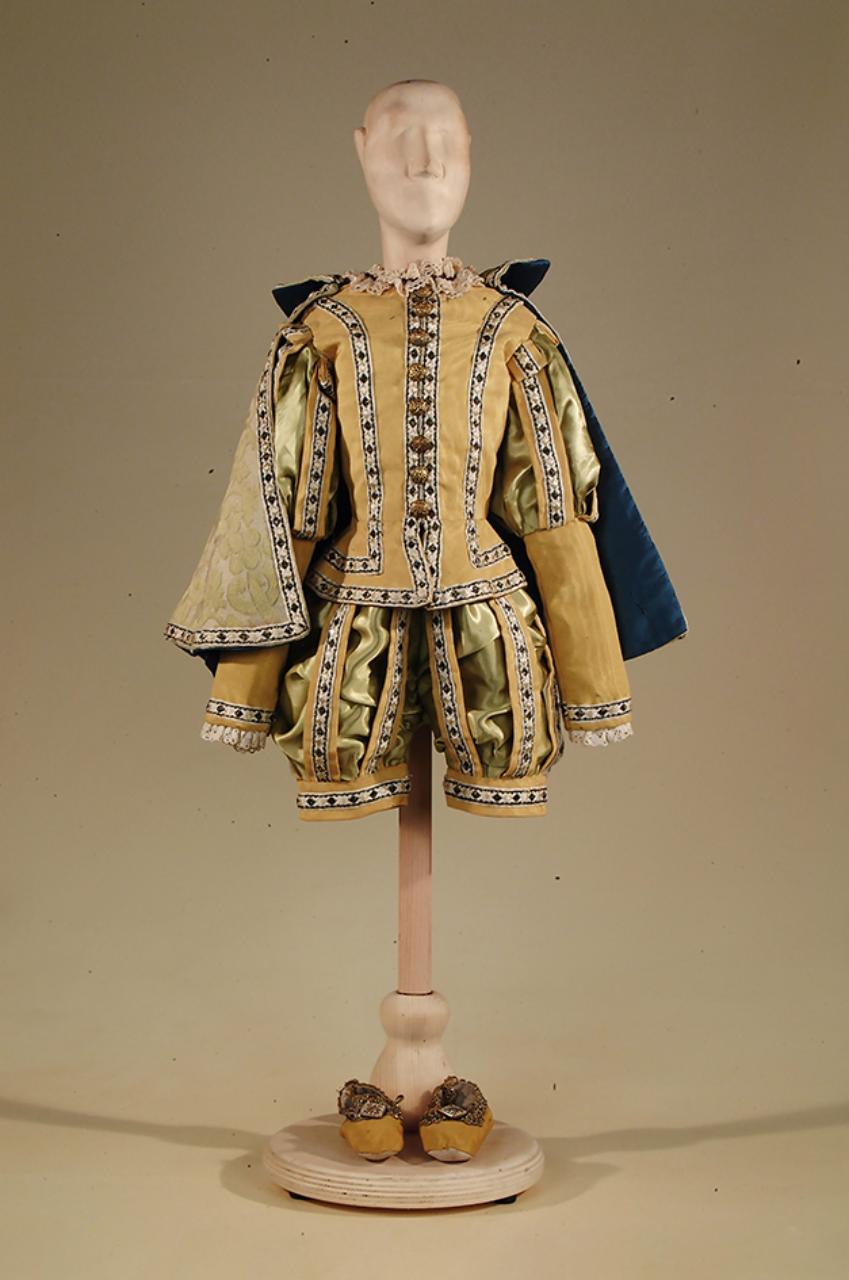 Costume da nobiluomo di foggia cinquecentesca composto da braghe, farsetto, mantellina, scarpe, calzamaglia e cintura.