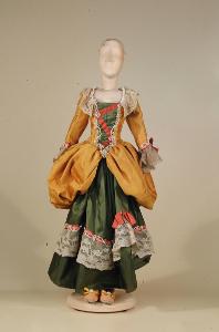 Costume femminile di foggia settecentesca composto da gonna, corpino e scarpe.