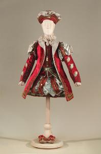 Costume per nobiluomo di foggia cinquecentesca composto da braghe, farsetto, sopravveste, cintura, cappello e scarpe.