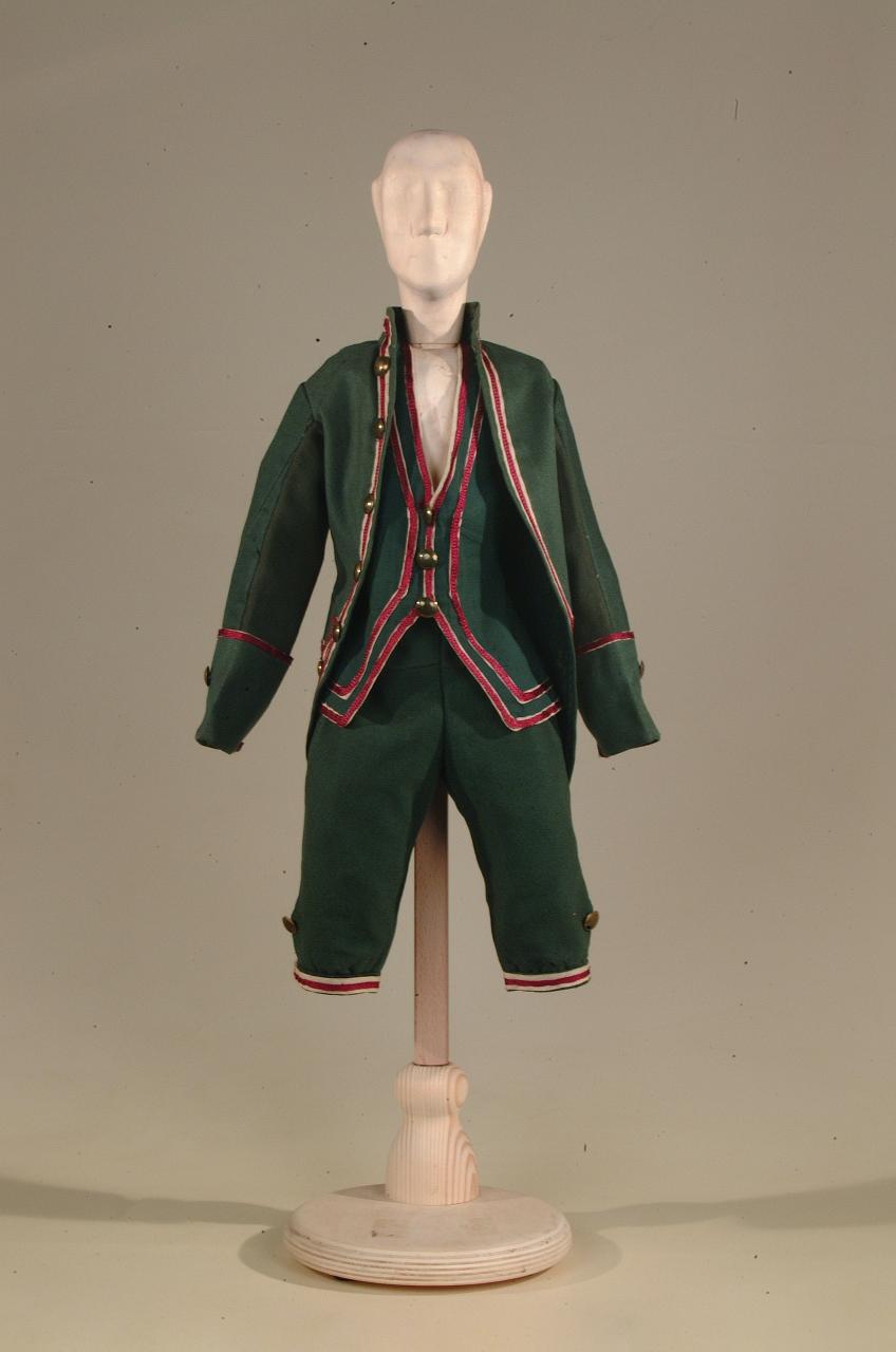 Costume maschile di foggia settecentesca composto da pantaloni, giacca e gilet