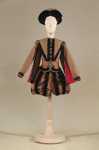 Costume maschile borghese di foggia cinquecentesca composto da braghe, farsetto, cintura e cappello.