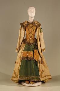 Costume per dama di foggia cinquecentesca composto da gonna, corpino, collo e scarpe.