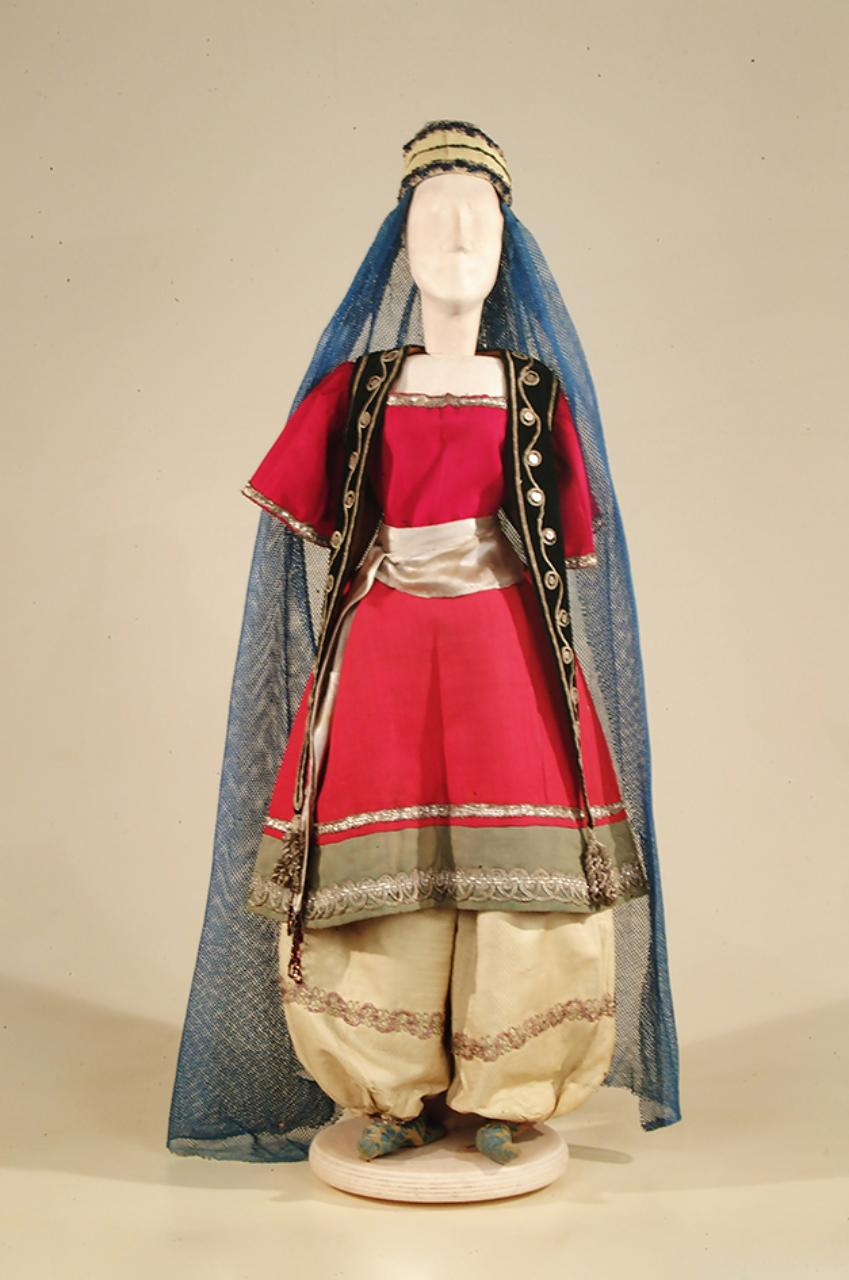 Costume femminile di nobile medio orientale composto da pantaloni, veste, bolero, fusciacca, scarpe, velo e copricapo.