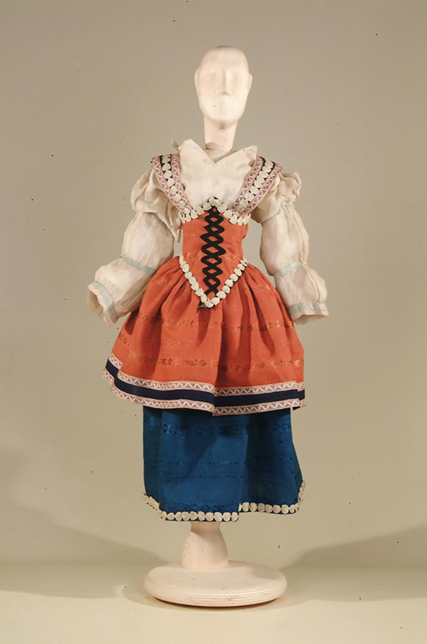 Costume per popolana di foggia cinquecentesca composto da gonna, camicetta, bustino e bretelle.
