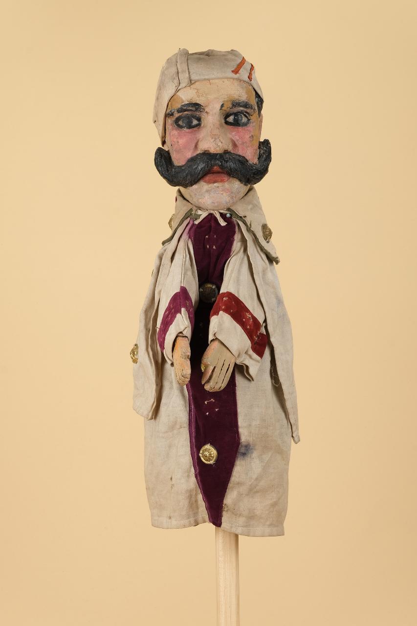 Questo burattino raffigura un personaggio in uniforme militare, probabilmente un ufficiale.
