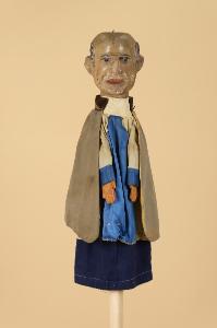 Burattino di uomo calvo con mantello.