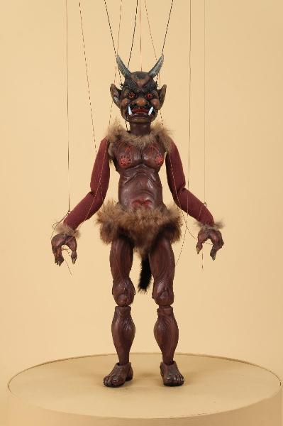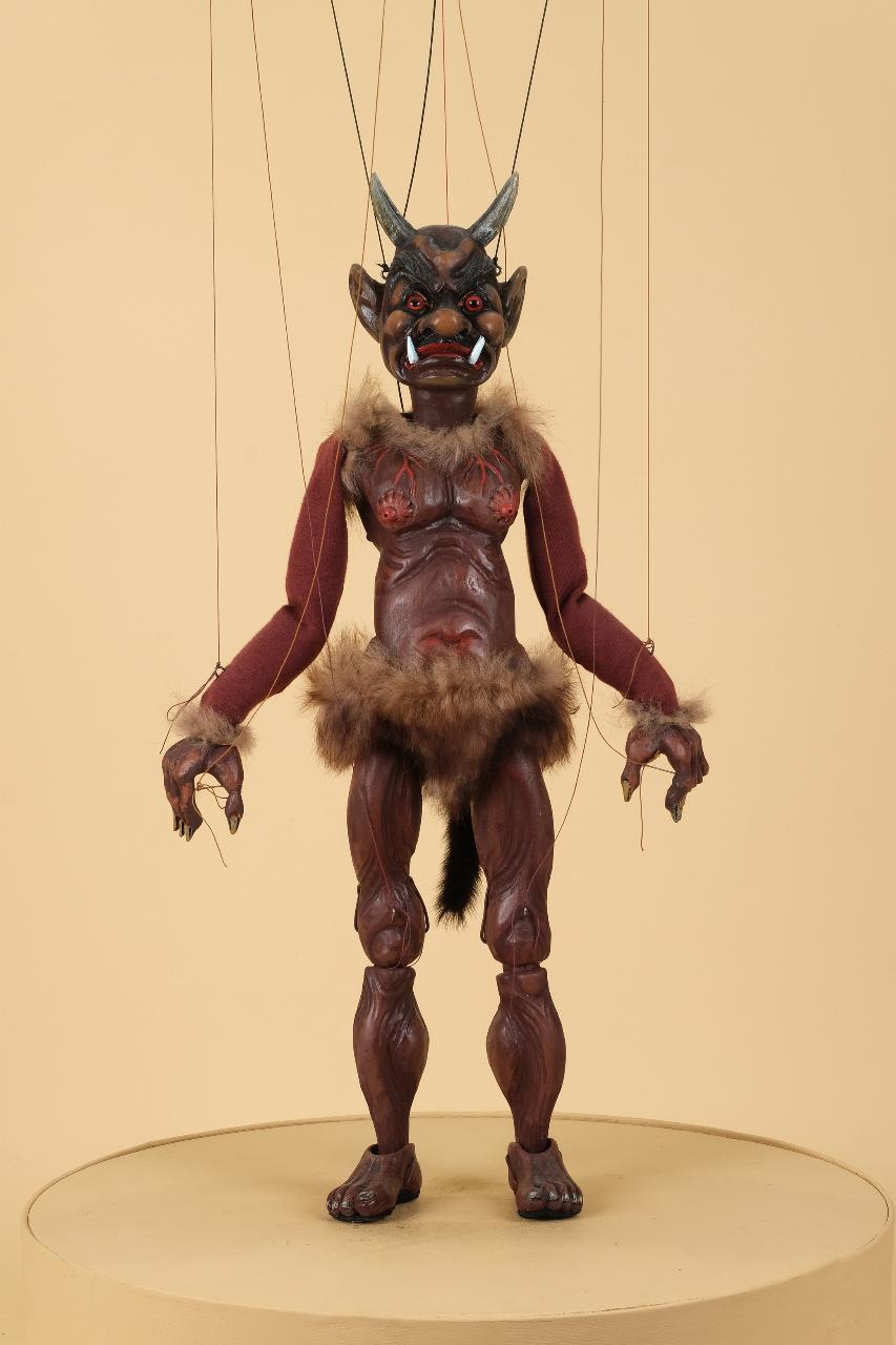 La marionetta raffigura il personaggio di un diavolo e fa parte di un gruppo di tre figure similari. Il corpo è interamente articolato e scolpito evidenziando le parti anatomiche con caratteri orrorifici. Il volto riporta un ghigno serrato con denti a zanna. Il naso è tondo e pronunciato, mentre le sopracciglia folte ed inarcate fan da contorno agli occhi animaleschi in vetro rossiccio, incastonati. Le orecchie sono pronunciate appuntite. Ad accentuare l'aspetto diabolico del carattere, dal cranio spuntano due corna costolute ed affilate, ricurve verso l'alto. Le braccia in tessuto imbottito, ricoperto di maglina di cotone marrone, terminano con mani mobili scoplite ad artiglio come i piedi. La colorazione dell'insieme è giocata sulle tonalità marroni, bruno rossiccie. Alcuni inserti in pelliccia raccordano il collo, le ascelle ed il bacino oltre a costituire la coda. Il bilancino è a croce.