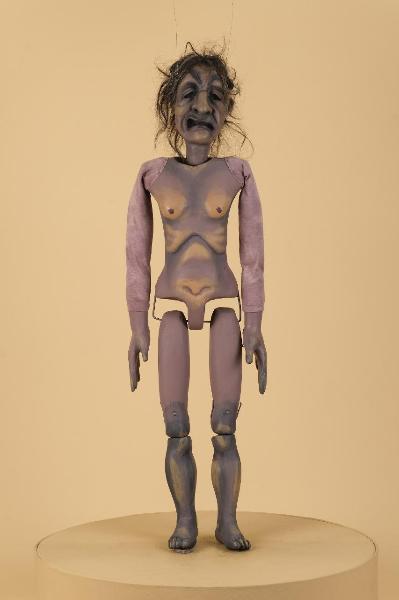 La marionetta raffigura il personaggio simbolico di un "dannato" e fa parte di un gruppo di più figure simiari. La scultura del personaggio non si limita al volto e alle mani tese a dita separate, ma si estende anche al busto e alla parte inferiore delle gambe, riportano i tratti anatomici dell'essere umano. Il volto riporta una smorfia di sofferenza e dannazione accentuata dal vuoto degli occhi e del ghigno della bocca. la testa, le mani e i piedi sono realizzati in legno di tiglio mentre il busto e le cosce sono in legno di abete. La colorazione ripropone un incarnato livido giocato sulle tonalità bruno violacee. Il bilancino è a croce.