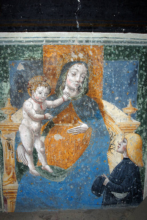 L'affresco, posizionato all'interno della cantoria, raffigura la Madonna, con un abito in broccato dorato stretto in vita da un nastro sormontato da un manto blu punteggiato di stelle, con il Bambino in piedi sulle sue ginocchia, entrambi posti su un trono marmoreo con spalliera coperta da un drappo nello stesso tessuto dell'abito di Maria. Dietro al capo le due aureole in parte prive della doratura, rivelano una decorazione a punzone tondo e a raggiera, quella di Gesù arricchita dal segno rosso della croce. Il Bambino indossa collana e braccialetto di corallo, simboli apotropaici, ed è in posizione benedicente verso il donatore posto di profilo a destra e con la berretta in mano. Il dipinto murale appare oggi tagliato in orizzontale, in seguito al progetto realizzato nel 1538 quando, secondo il Cernuscolo, si commissiona la cantoria dall'ornato simile a quella dell'organo.