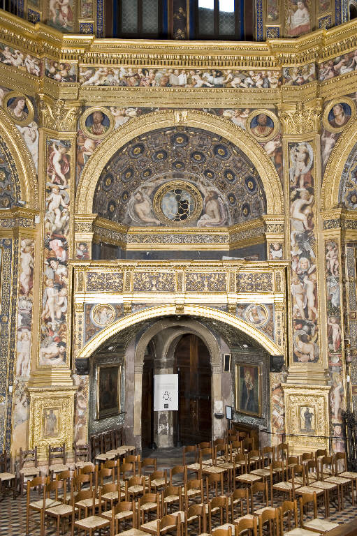 - NOTIZIE STORICO CRITICHE Il secondo ordine della chiesa dell'Incoronata è costituito dal matroneo, percorribile, formato da bifore a tutto sesto con colonne centrali che seguono tutto il perimetro della pianta ottagonale. A segnare gli angoli paraste a libro. Il pittore che interviene nel 1877 riprende la decorazione dei Piazza dell'ordine inferiore, pur con schemi piuttosto irrigiditi. Sopra ogni colonna sono posti gli stemmi dei benefattori della chiesa e quello del Comune di Lodi. In prossimità dell'altare maggiore, le paraste riprendono la decorazione impostata da Battagio, cioè a candelabra dorata su fondo blu in cui si trova inscritta la data "1877". Le volte a crociera costolononate hanno nella chiave di volta una rosa, mentre il fondo blu è tempestato di stelle in stucco dorato.