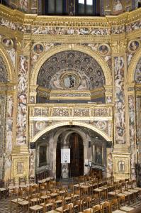 Secondo ordine costituito dal matroneo percorribile formato da bifore con colonna centrale e archi a tutto sesto che segue tutto il perimetro della chiesa; capitelli corinzi e profilatura degli archi in oro, come i decori vegetali della colonne; parete di fondo con finestre a vetri tondi, paraste che scandiscono gli angoli.