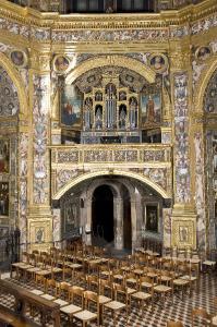 - NOTIZIE STORICO CRITICHE L'organo venne realizzato da Domenico da Lucca, organario originario di Lucca. L'organo presenta sei registri e la separazione degli stessi della famiglia principale costituisce l'aspetto innovativo rispetto al ripieno in blocco medievale e tardogotico, con la disposizione delle canne dal basso verso l'acuto. Possiede un'unica tastiera di 50 tasti (do1-fa5) con prima ottava corta, una pedaliera scavezza a leggio di 17 tasti (do1-la2; il la2 aziona il rollante), 17 manette ad incastro per l'inserimento dei registri. Corredato dagli accessori: unione tasto/pedale, pedalone per l'inserimento dei registri di Ripieno, pedalone della combinazione libera "alla lombarda". Venne restaurato da Giovanni Battista Chiesa nel 1775.