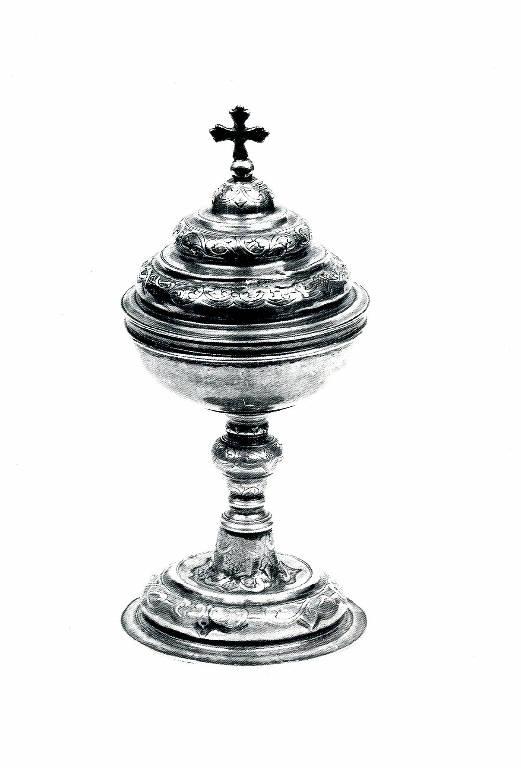 Pisside da viatico con piede a sezione circolare modanato con bombatura percorsa da decori a nastri intrecciati stilizzati che si ripropongono sul collo ad imbuto accompagnate da elementi a griglia. Fusto a diverse strozzature con nodo a ghianda su cui si ripropongono analoghi motivi ornamentali; similari decori caratterizzano le due bombature del coperchio e la cupola, sovrastata da una sferetta con crocetta apicale; la coppa è invece liscia.