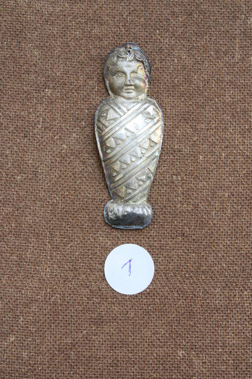 Raffigurante un uomo orante di profilo, genuflesso nell'atto di offrire un cuore fiammeggiante