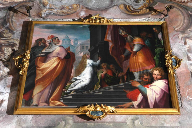 - NOTIZIE STORICO CRITICHE Il 5 novembre 1605 la Confraternita dell'Immacolata Concezione affida a Camillo Procaccini le pitture per ornare le pareti della stessa, stendendo un documento con clausole ben precise, in primis che tuti i dipinti siano di mano dll'artista, data l'abbondante produzione del predetto con la sua prolifica bottega. Oltre alle Storie della Vergine, il Procaccini aggiunge dodici quadretti con le Prerogative della Vergine, poi diventati quattordici e rimossi in occasione della ristrutturazione settecentesca perchè logori. Nelle tele rimaste l'artista si esprime mediante un linguaggio misurato tale da rendere facilmente comprensibili ai fedeli gli episodi evangelici. Questa capacità, unita all'uso di colori brillanti e quasi smaltati, gli permette di ottenere un vasto successo.