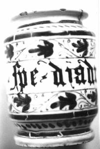 Alberello di farmacia con corpo troncoconico, collo e piede bassi rinforzati. Colori: blu su fondo bianco.