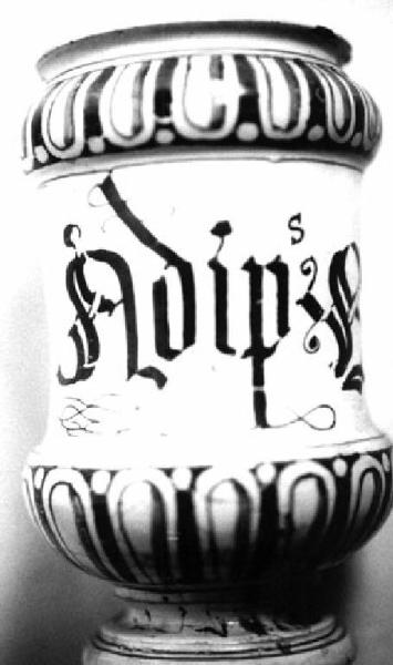 Alberello di farmacia con orlo espanso, corpo a rocchetto, piede sagomato. Colori: blu su fondo bianco.
