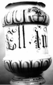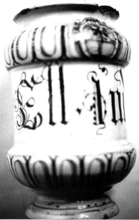 Alberello di farmacia con orlo espanso, corpo a rocchetto, piede sagomato. Colori: giallo, blu su fondo bianco.