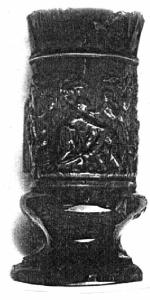 Vaso cilindrico con piede modanato. Colori: giallo su fondo marrone.