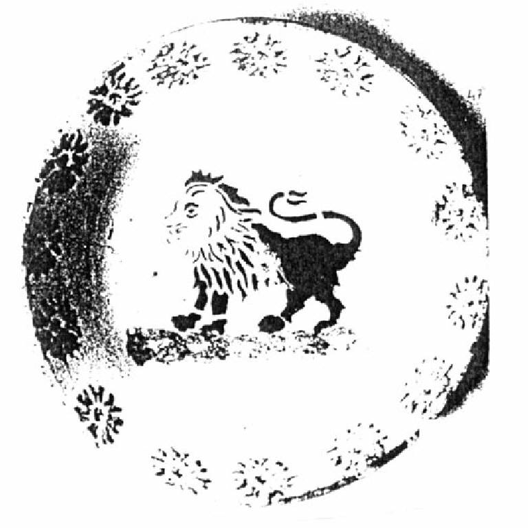 Scodella con bordo arrotondato e sagomato, fondo piano, apodo. Colori: marrone, rosso e verde su fondo bianco.