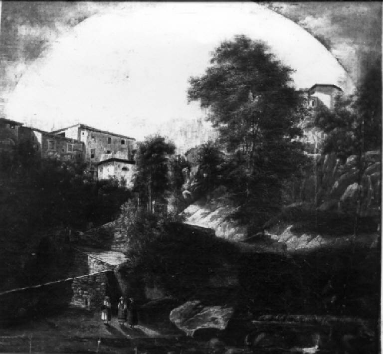 PAESAGGIO CON CONTADINE, ALBERI E CASE