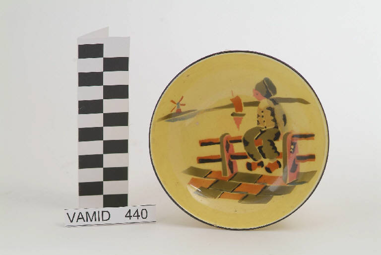 Ciotola circolare; fondo giallo decorato con paesaggio olandese in rosa, arancio, marrone, azzurro e verde; bordo rifinito con filettatura nera.
