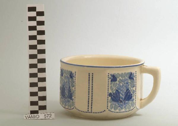 Pitale con piede circolare; manico liscio; fondo bianco decorato con motivo geometrico e vegetale in blu all'esterno; bordo rifinito in blu.