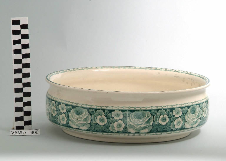 Catino lavamano a sezione circolare con bordo estroflesso; fondo bianco con motivo floreale (primule e rose) in verde all'esterno e motivo decorativo geometrico in verde lungo il bordo interno.