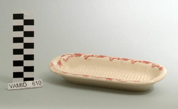 Portasapone di forma ovale con bordo estroflesso; fondo color avorio decorato con motivo floreale (campanule) in bordeaux lungo il bordo interno.