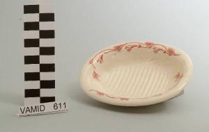 - NOTIZIE STORICO CRITICHE Il portasapone, appartenente ad un servizio da camera (nn. inv. 607-611), è decorato sottosmalto con transfer di colore bordeaux. Si suppone che il nome "LOLA" presente nel marchio indichi il tipo di ornamento. Il confronto stilistico con altri servizi da camera prodotti dalla stessa manifattura aventi un decoro simile fa ipotizzare una realizzazione a cavallo tra Ottocento e Novecento.