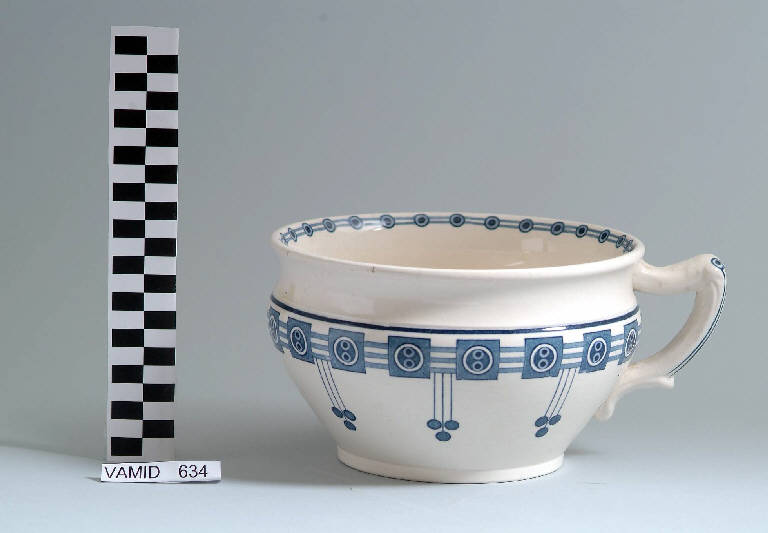 - NOTIZIE STORICO CRITICHE Il pitale, appartenente ad un servizio da camera (nn. inv. 633-634, 637), è decorato con transfer di colore blu. Si suppone che il nome "CLARA" presente nel marchio indichi il tipo di ornamento. La linea ancora classica dell'oggetto in esame e il motivo decorativo geometrico indicano una datazione entro il primo quarto del Novecento.