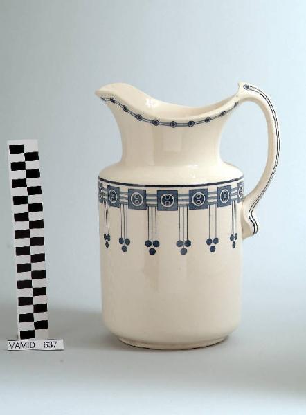 Brocca con manico mistilineo; piede circolare; beccuccio sporgente; fondo color avorio con motico decorativo geometrico in blu all'esterno.