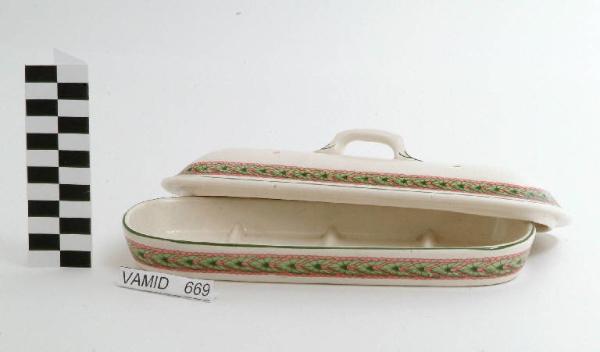 Portasapone di forma allungata; fondo bianco con motivo a foglie d'edera in verde e rosa all'esterno; bordo rifinito con filettatura verde. Coperchio di forma ovale con presa apicale, fondo bianco con motivo a foglie d'edera in verde e rosa all'esterno; manico rifinito con filettatura verde.