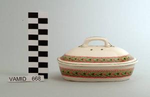 Portasapone di forma ovale; fondo bianco con motivo a foglie d'edera in verde e rosa all'esterno; bordo rifinito con filettatura verde. Coperchio di forma ovale con presa apicale, fondo bianco con motivo a foglie d'edera in verde e rosa all'esterno; manico rifinito con filettatura verde.