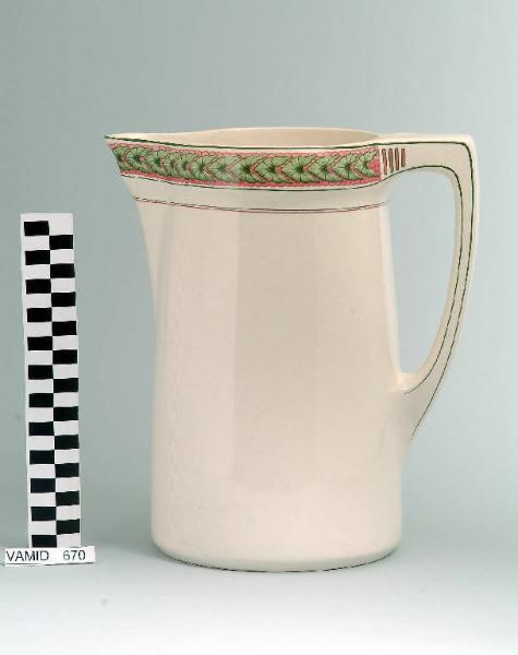 Brocca con piede circolare; beccuccio sporgente; manico squadrato; fondo bianco con motivo a foglie d'edera in verde e rosa all'esterno; bordo e manico rifiniti con filettatura verde.