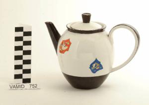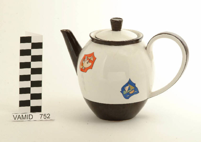 Teiera con corpo globulare; piede circolare; manico a "C"; beccuccio sporgente; coperchio con presa apicale. In basso esternamente, vicino all'appoggio, fascia nera sull'orlo; sul bordo del manico filettatura nera; beccuccio e manico apicale di colore nero. Fondo di colore bianco con quattro specchiature mistilinee con soggetti decorativi su fondo colorato (rispettivamente tavolozza con pennello e tempere, barca con squadra, chitarra con note e carte da gioco, sedie con architettura e ombrellone).