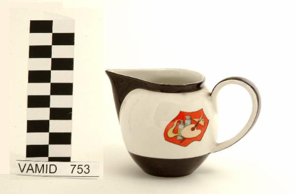 Lattiera con corpo globulare; piede circolare; manico a "C"; beccuccio sporgente. In basso esternamente, vicino all'appoggio, fascia nera sull'orlo; sul bordo del manico filettatura nera; beccuccio di colore nero. Fondo di colore bianco con tre specchiature mistilinee con soggetti decorativi su fondo colorato (rispettivamente casa con barca, tavolozza con pennello e tubetti di colore, barca con riga).