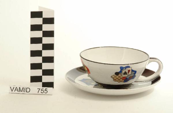Tazza da thè troncoconica, aperta e leggermente bombata, con manico a "C". In basso esternamente, vicino all'appoggio, fascia nera sull'orlo e sul bordo del manico filettatura nera. Fondo bianco con tre specchiature mistilinee con soggetti decorativi su fondo colorato (rispettivamente carte da gioco con gioco della dama e pipa, gioco della dama con carte da gioco e pipa, la fabbrica delle ceramiche di Laveno con libro). Piattino circolare privo di tesa; fondo bianco con tre specchiature mistilinee con soggetti decorativi su fondo colorato (rispettivamente una barca a vela, carte da gioco con gioco della dama, carte da gioco con gioco della dama e pipa) in posizione decentrata; fascia marrone sul bordo.