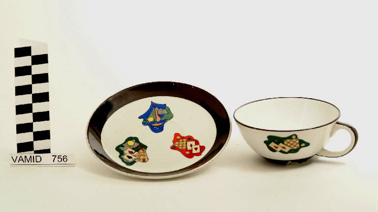 Tazza da thè troncoconica, aperta e leggermente bombata, con manico a "C". In basso esternamente, vicino all'appoggio, fascia nera sull'orlo e sul bordo del manico filettatura nera. Fondo bianco con tre specchiature mistilinee con soggetti decorativi su fondo colorato (rispettivamente carte da gioco con gioco della dama, barca con edificio, gioco della dama con carte da gioco e pipa). Piattino circolare privo di tesa; fondo bianco con tre specchiature mistilinee con soggetti decorativi su fondo colorato (rispettivamente una barca a vela, carte da gioco con gioco della dama, carte da gioco con gioco della dama e pipa) in posizione decentrata; fascia marrone sul bordo.